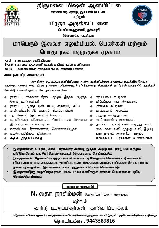 Kaveripakkam, November 16, 2024 – In a commendable initiative to promote community health, Tirumalai Mission Hospital and Pradha Foundation jointly organized a Bone and Women’s Health Camp on November 16, 2024, at Kaveripakkam. The camp provided free health check-ups, consultations, and awareness sessions, benefiting hundreds of residents, especially women and the elderly.